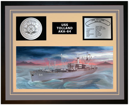 This is a beautiful ship display commemorating the USS TOLLAND (AKA-64). The artwork depicts the USS TOLLAND in all her glory. More than just an artistic concept of the ship, this display includes a custom designed ship crest plaque and an engraved ship statistics plaque. This product is richly finished with custom cut and sized double mats and framed with a high quality black frame. Only the best materials are used to complete our ship displays. Navy Emporium Ship Displays make a generous and personal gift for any Navy sailor.