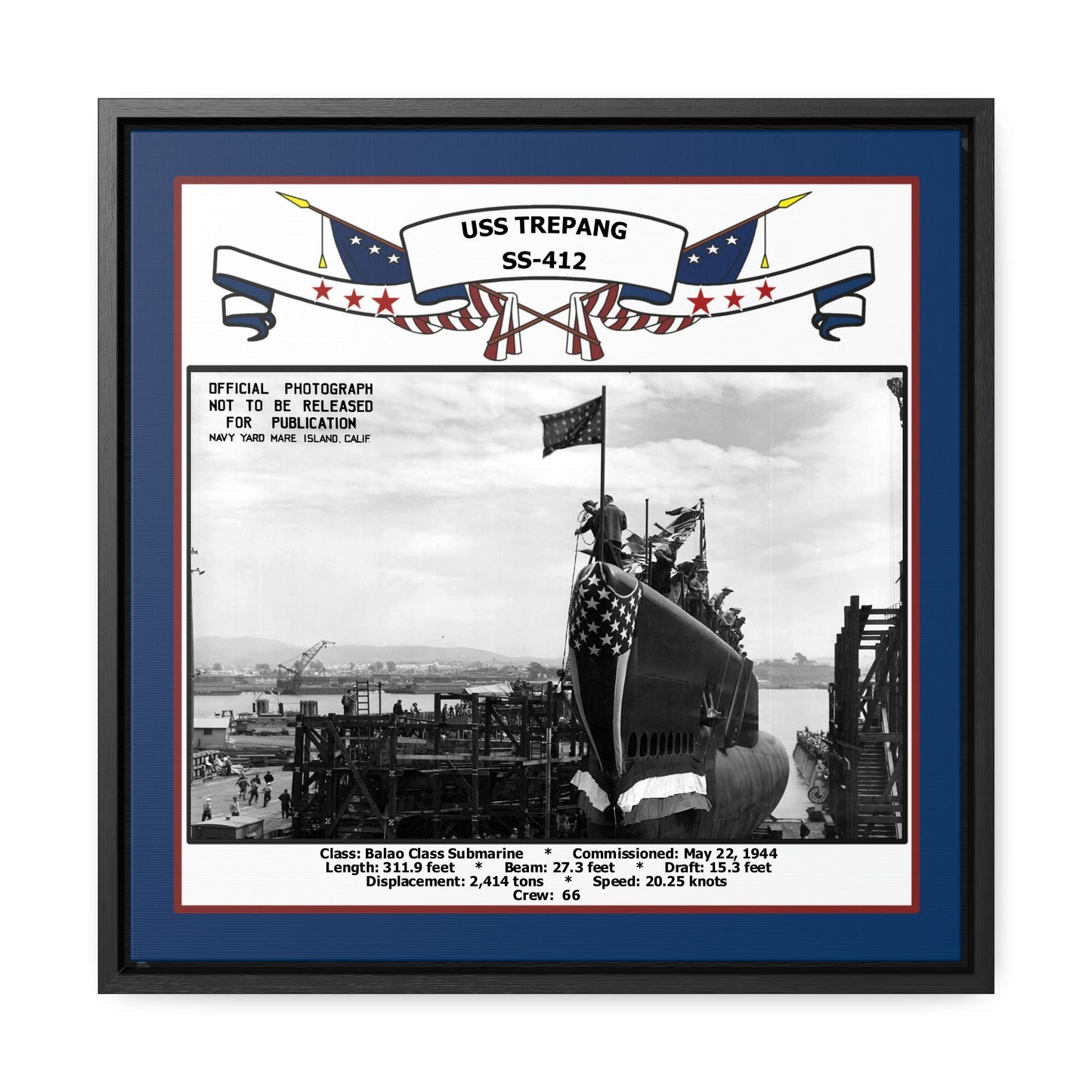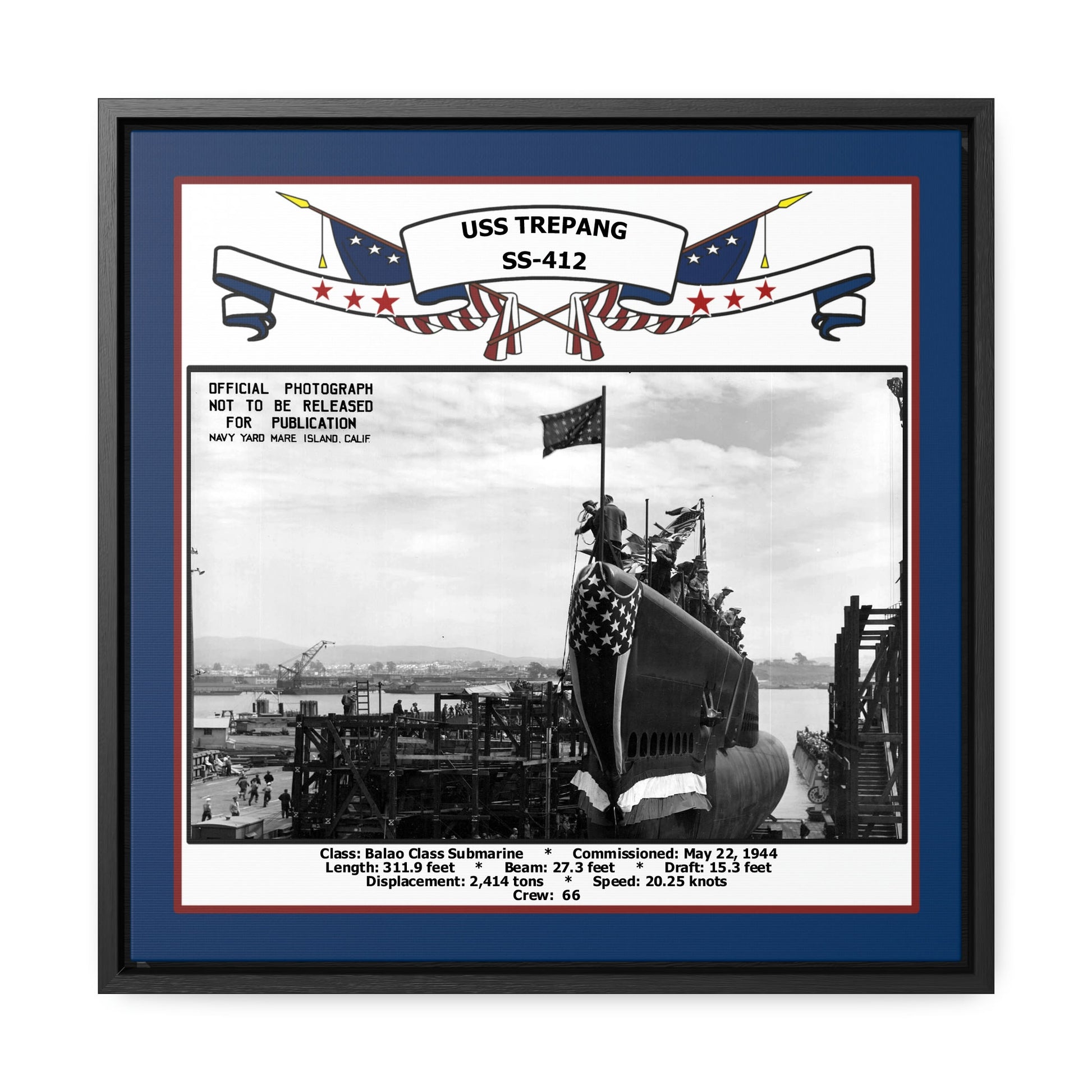 Your Navy Veteran will love this 16 x 16 inch canvas photo print of the USS Trepang SS-412. This print is richly displayed in a black floating frame. Available with a printed blue border color.