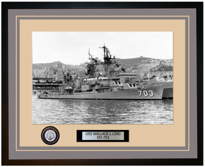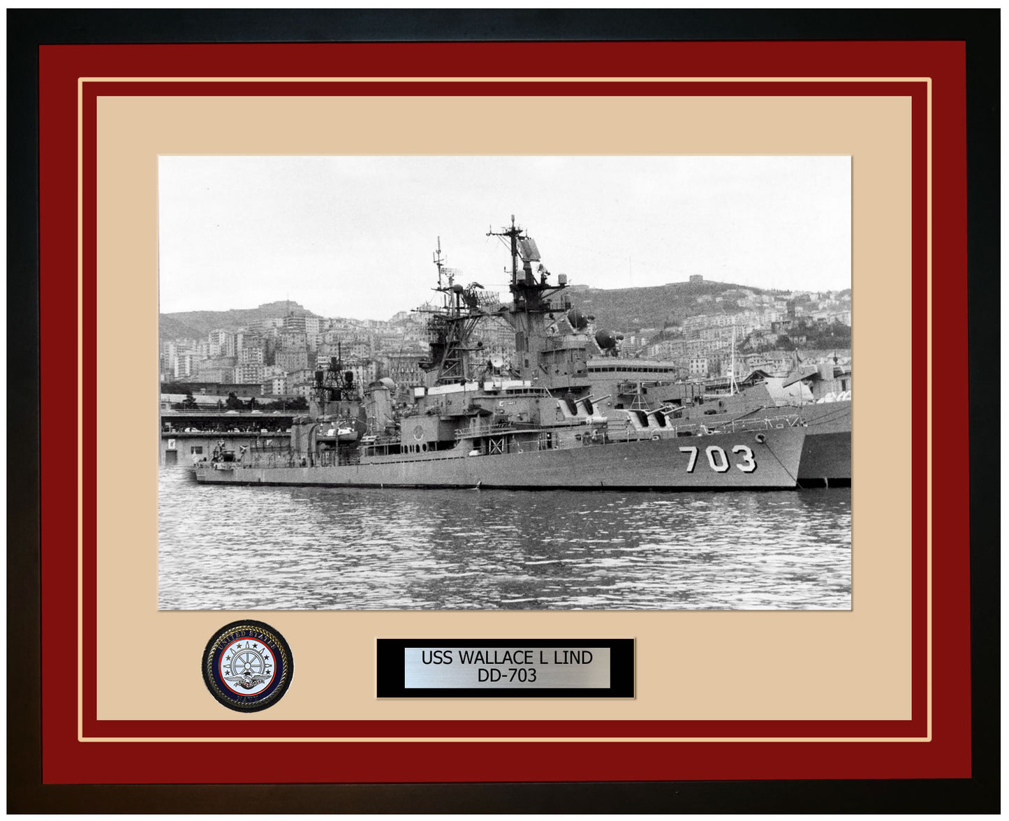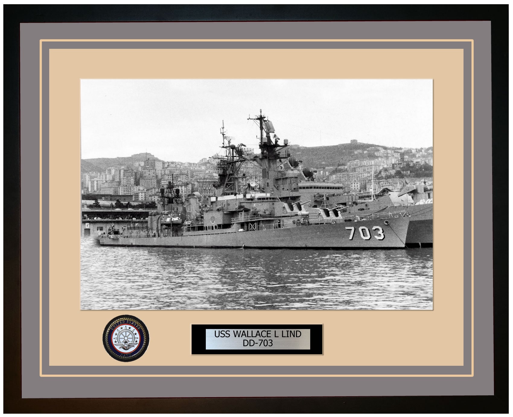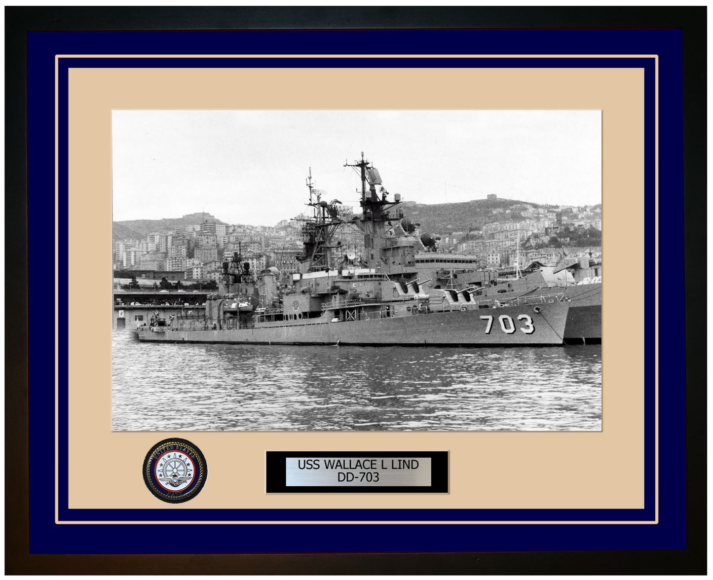 This photo of the USS WALLACE L LIND (DD-703) is framed and double matted with the highest quality construction in mind. The ship name and designation is engraved on chrome engraving stock and set on a beautiful felt backing. All this set in a custom cut fine inner mat and your choice of colors for the outer mat. The v-groove in the outer mat and custom engraving add high quality details that properly honor all the service members who served on this fine ship.