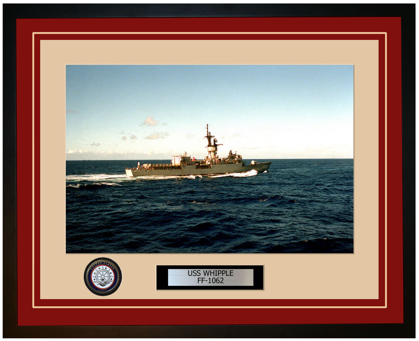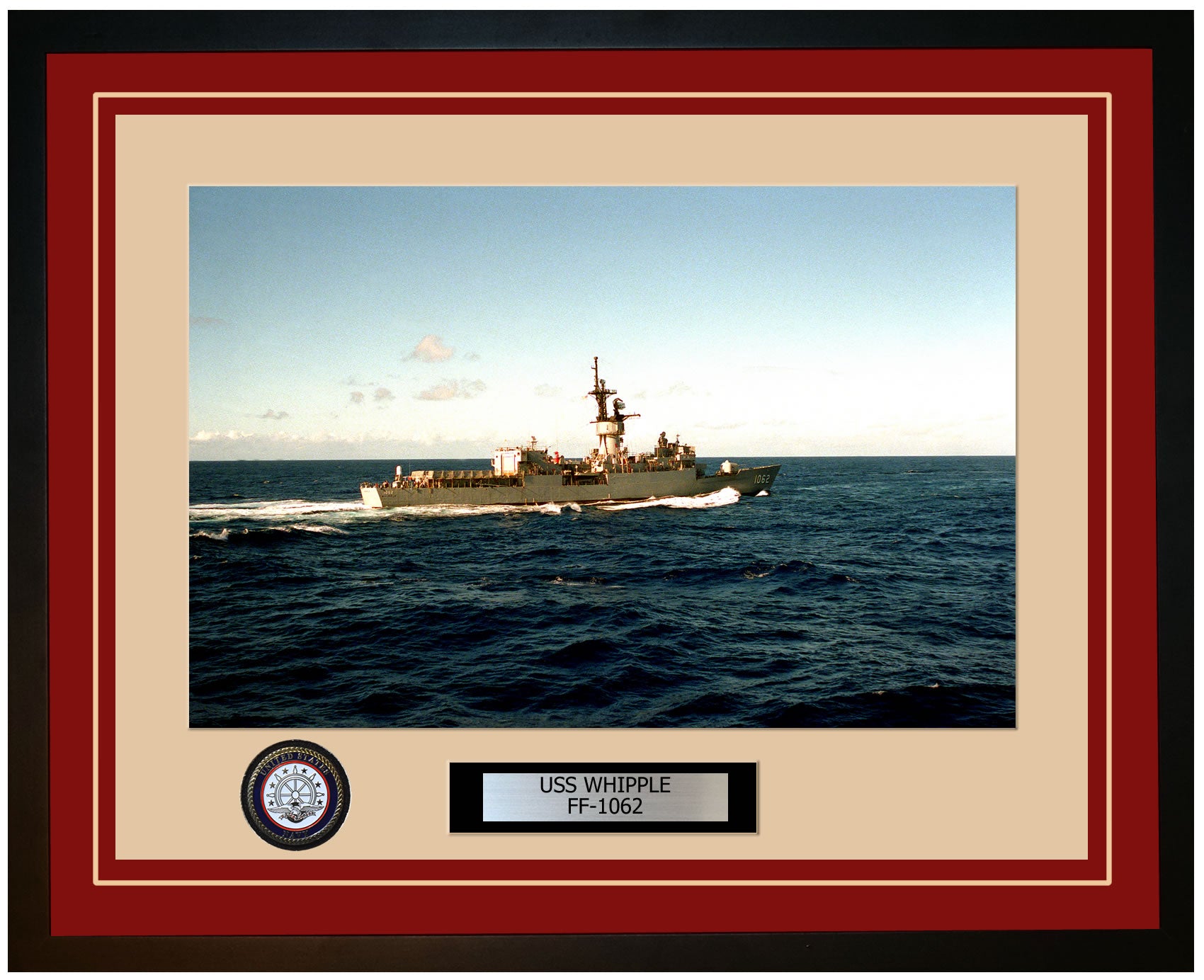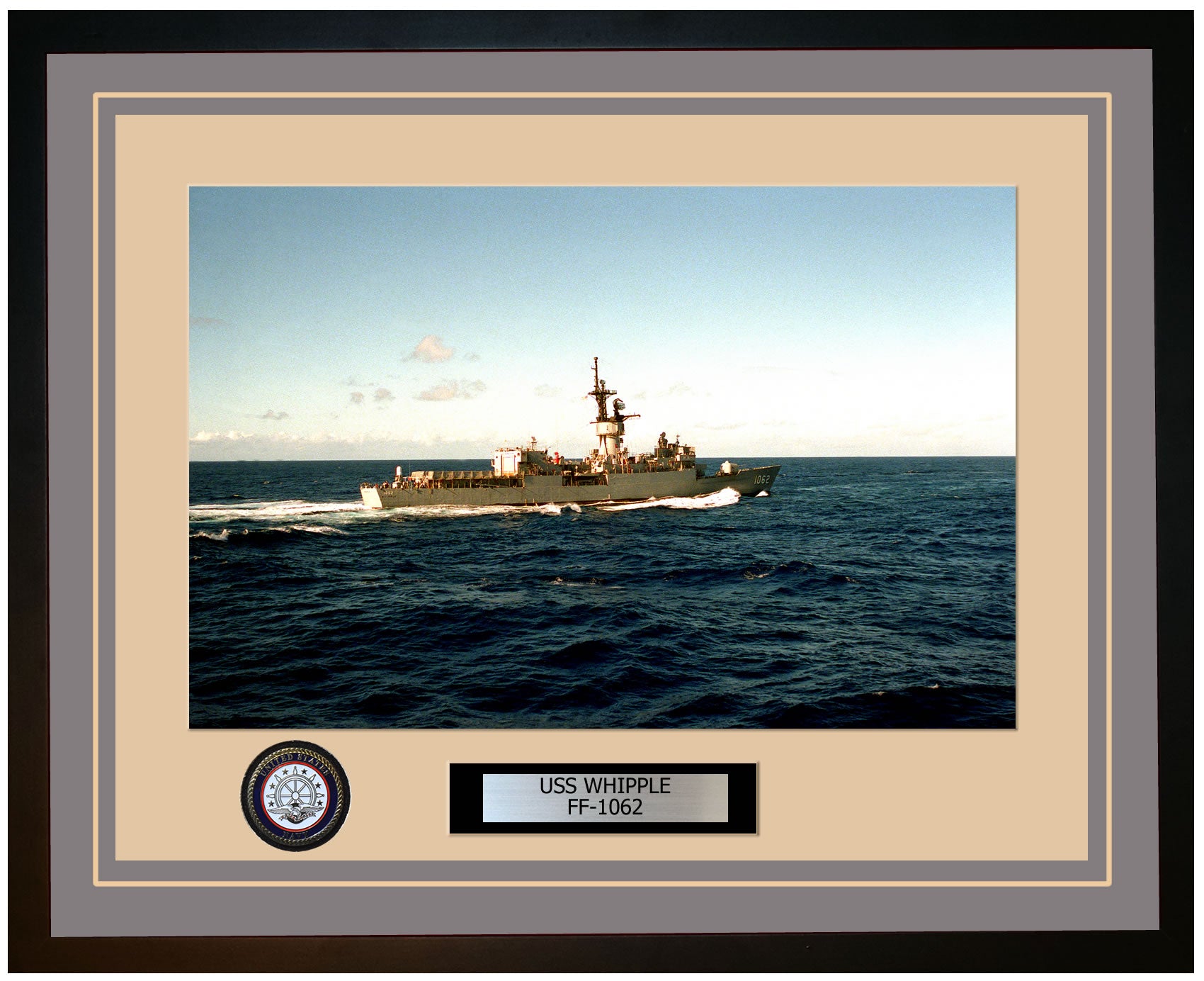 This photo of the USS WHIPPLE (FF-1062) is framed and double matted with the highest quality construction in mind. The ship name and designation is engraved on chrome engraving stock and set on a beautiful felt backing. All this set in a custom cut fine inner mat and your choice of colors for the outer mat. The v-groove in the outer mat and custom engraving add high quality details that properly honor all the service members who served on this fine ship.