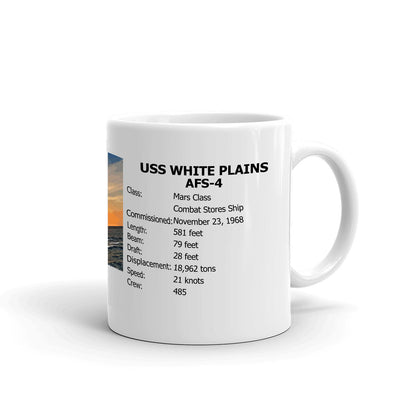 Celebrate your Navy pride with this USS WHITE PLAINS AFS-4 Coffee Mug. Pictured is custom art of your ship! Whether you're drinking your morning coffee, evening tea, or something in between “ this mug's for you! It's sturdy and glossy with a vivid print that'll withstand the microwave and dishwasher.