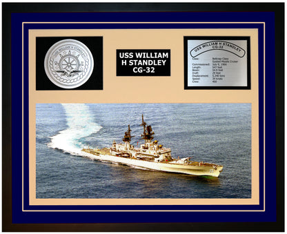 This is a beautiful ship display commemorating the USS WILLIAM H STANDLEY (CG-32). The artwork depicts the USS WILLIAM H STANDLEY in all her glory. More than just an artistic concept of the ship, this display includes a custom designed ship crest plaque and an engraved ship statistics plaque. This product is richly finished with custom cut and sized double mats and framed with a high quality black frame. Only the best materials are used to complete our ship displays. Navy Emporium Ship Displays make a generous and personal gift for any Navy sailor.