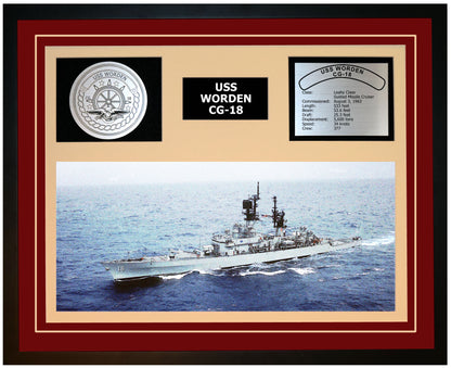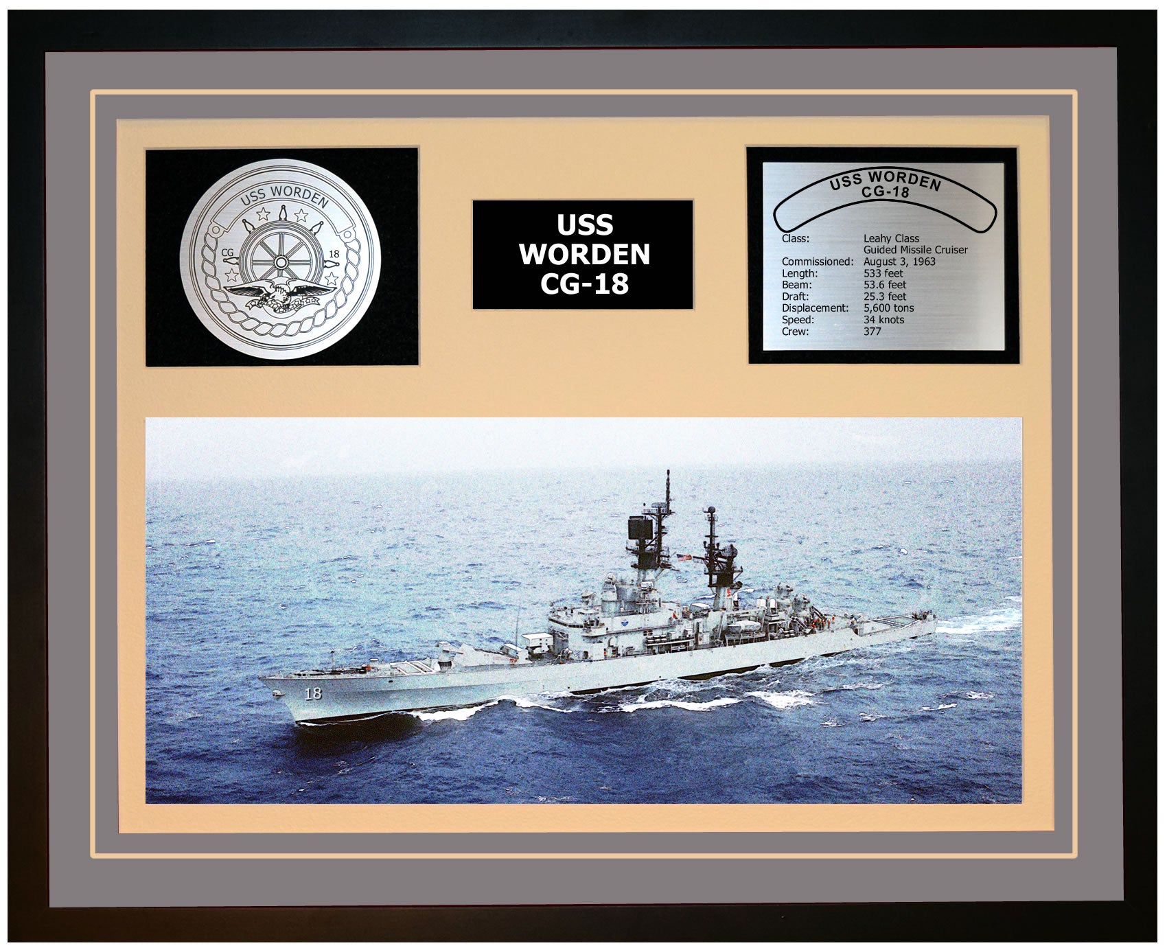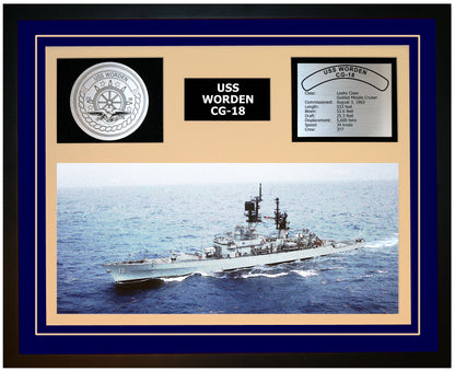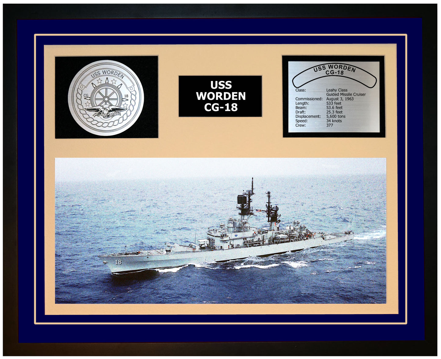 This is a beautiful ship display commemorating the USS WORDEN (CG-18). The artwork depicts the USS WORDEN in all her glory. More than just an artistic concept of the ship, this display includes a custom designed ship crest plaque and an engraved ship statistics plaque. This product is richly finished with custom cut and sized double mats and framed with a high quality black frame. Only the best materials are used to complete our ship displays. Navy Emporium Ship Displays make a generous and personal gift for any Navy sailor.